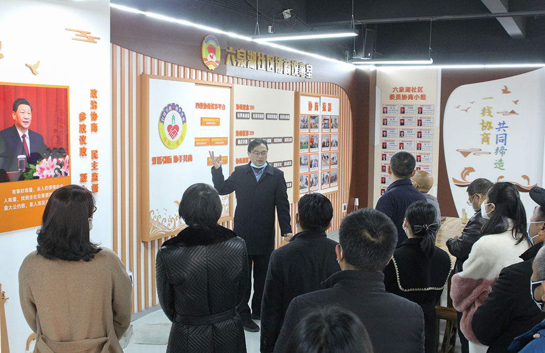 与会人员现场观摩六泉湖社区协商议事室建设情况,尹德斌进行讲解。