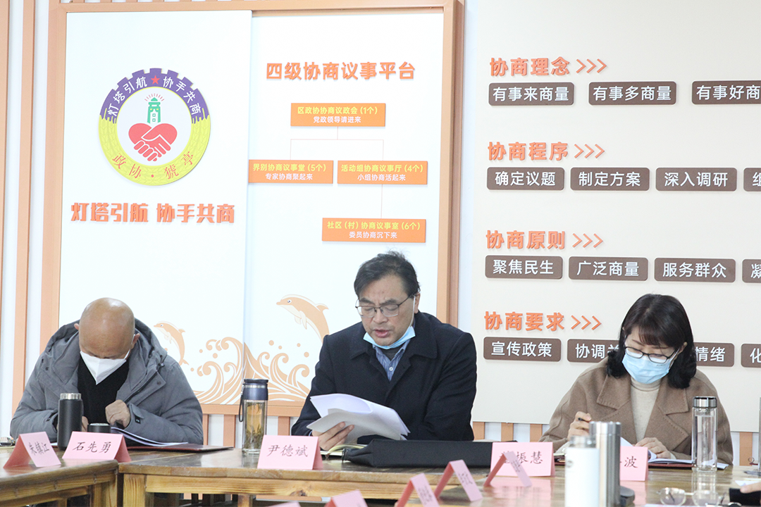 尹德斌强调,2023年,猇亭区政协要巩固“委员心连心·协商在一线”活动成效,全面开展“灯塔引航·协手共商”活动,以建设区政协、活动组、界别、社区四级平台16个协商阵地为基础,以规范协商程序为保障,以共同缔造为重点,以提升协商质效为目的,擦亮“灯塔引航·协手共商”品牌。