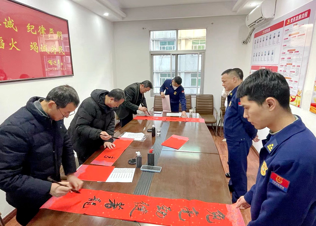 1月10日,葛洲坝紫阳消防救援站一派新春气象,宜昌市文联、西陵区政协联合组织多名书法家走进紫阳消防站,为一线消防队员现场书写春联,送去兔年春节的美好祝福。