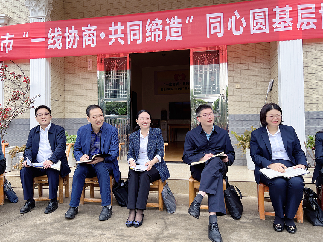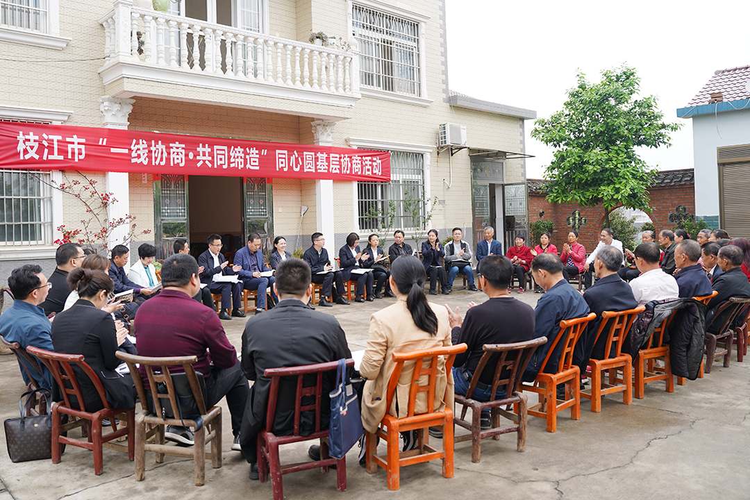 4月14日,枝江市顾家店镇熊家棚村村民雷超的家门口比往常热闹许多,不时传来笑声、掌声……原来,市政协顾家店镇第三协商小组正在举行“一线协商•共同缔造”同心圆基层协商活动,群众代表、政协委员、爱心企业家、镇村干部、驻村单位和相关部门负责人等五方代表40余人聚在这里,围绕“熊家棚村二组核心湾落建设”主题开展协商。市政协主席黄丹梅、副主席黄曈山出席活动。