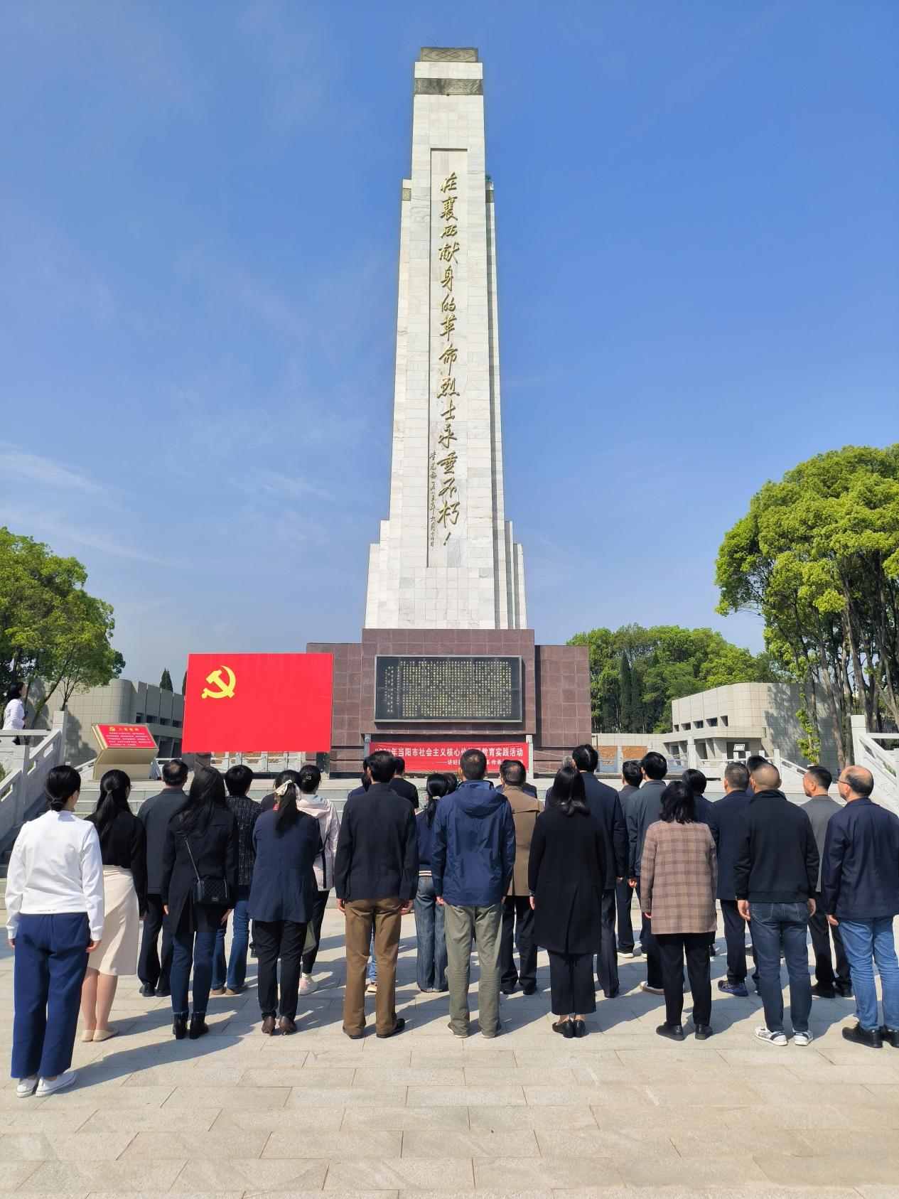 在襄西革命烈士纪念碑前,党员们整齐列队,向烈士敬献花篮、默哀、重温入党誓词,缅怀革命先烈。
