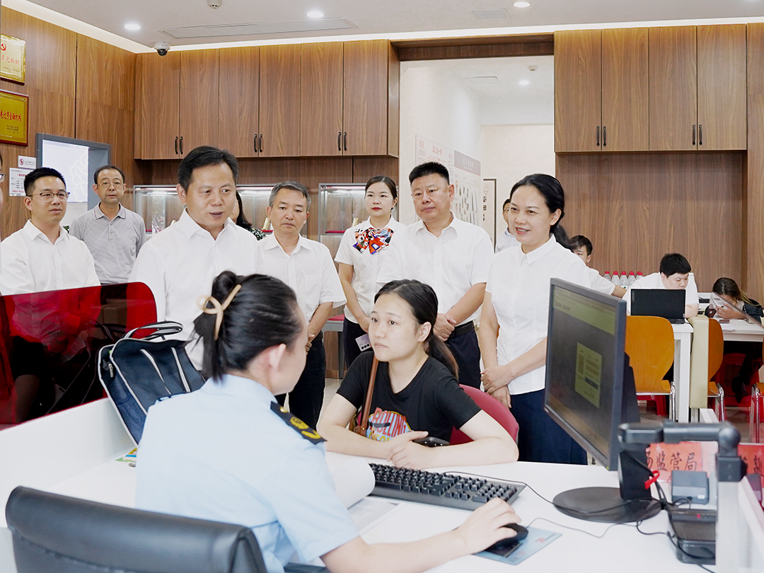 黄芳帅一行先后到中国工商银行三峡枝江支行证照办理大厅、枝江市政务服务中心市场主体办证窗口详细了解市场主体“一站式”办证服务情况。