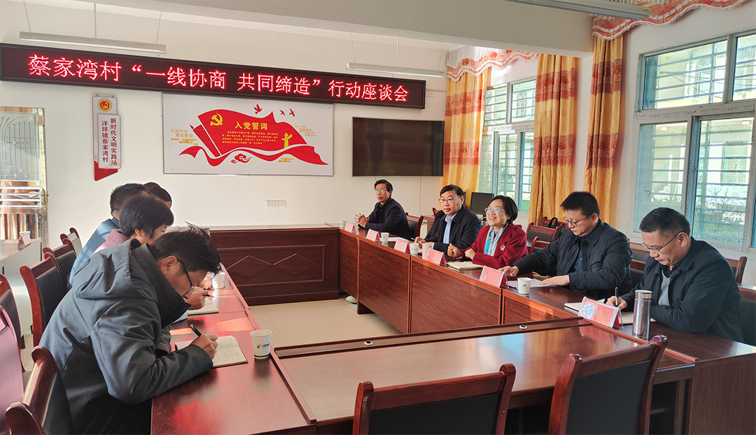 在洋坪镇蔡家湾村,王旭新带领罗方林、况庆雷等政协委员,与村干部、村民代表共绘蔡家湾乡村振兴发展蓝图。行动组一行就基础设施建设、村级产业发展等事项开展面对面交流,对蔡家湾村顺利推进油茶低改项目、修缮农田灌溉沟渠等成效表示肯定。政协委员罗方林、况庆雷、陈南平表示将共同捐赠15万元助力蔡家湾村乡村振兴建设,并为拓宽农特产品销售渠道提供力所能及的帮助。