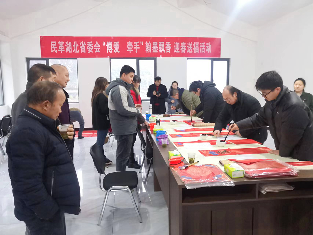 在昭君村村委会,湖北民革首义书画院贺亚刚、王伟、向明等书法家挥毫泼墨,为村民书写春联,送上新春美好祝福。(通讯员 邹志斌 审核 付兴洲)