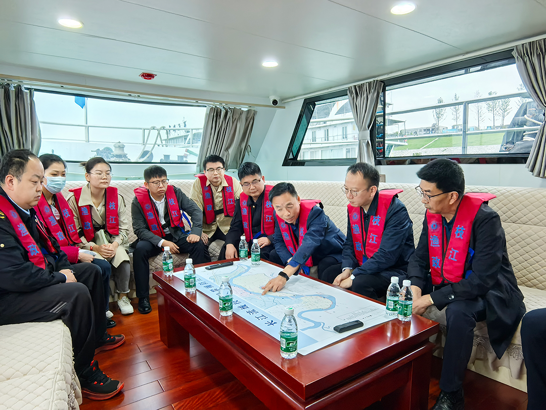 在渔政执法码头,政协委员们登上执法艇,对照渔政执法地图听取市农业农村局关于沿江禁渔“岗哨”分布及渔政执法情况介绍。