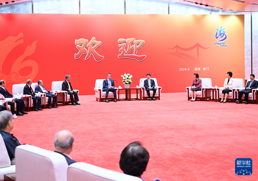 6月15日,第十六届海峡论坛大会在厦门举行。中共中央政治局常委、全国政协主席王沪宁出席并致辞。这是大会开始前,王沪宁会见参加论坛的台湾嘉宾代表。新华社记者 申宏 摄